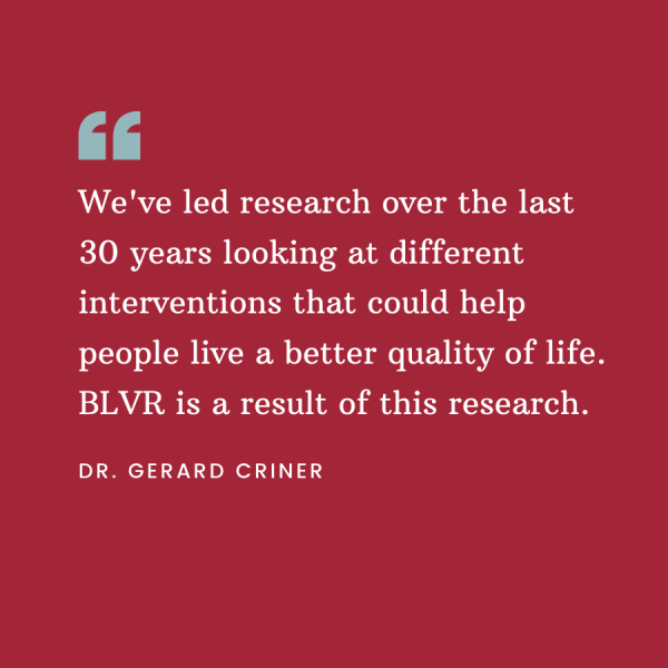 Dr. Criner: At Temple Lung Center, we've led research over the last 30 years looking at different interventions — whether it's medicines or physical therapy or devices — that could help people live a better quality of life, and in some cases a longer life. BLVR is a result of this research.